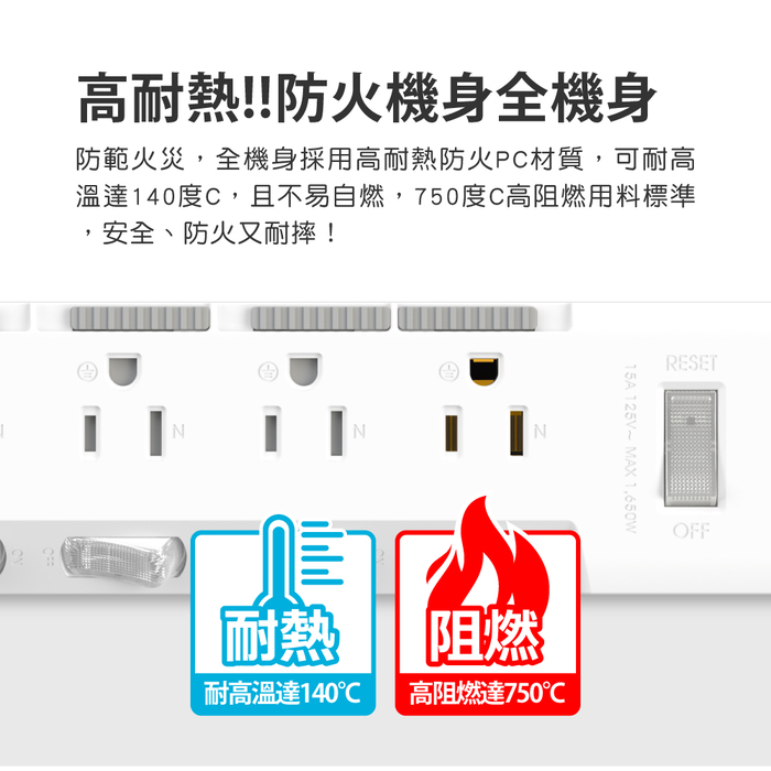強化用電安全,全機身使用聚碳酸酯(PC)材質,可耐高溫達140°C,且不易自燃,750°C高阻燃用料標準,