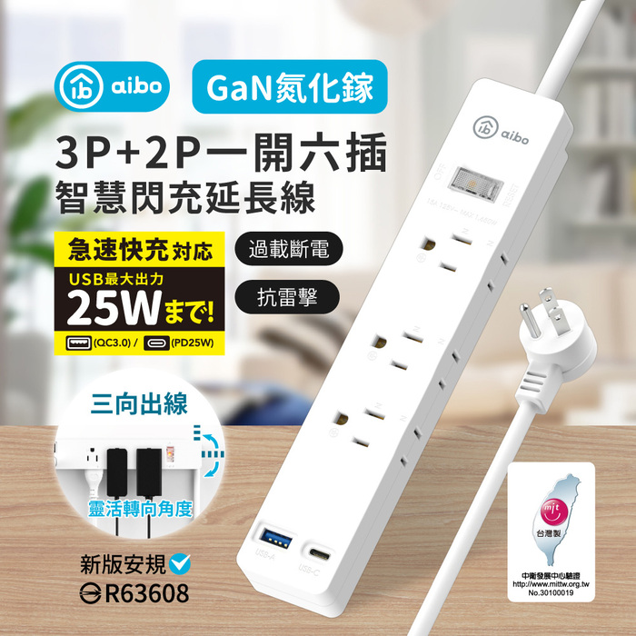 .商品名稱:aibo 1開6插PD25W快充 專利三向出線抗雷擊延長線