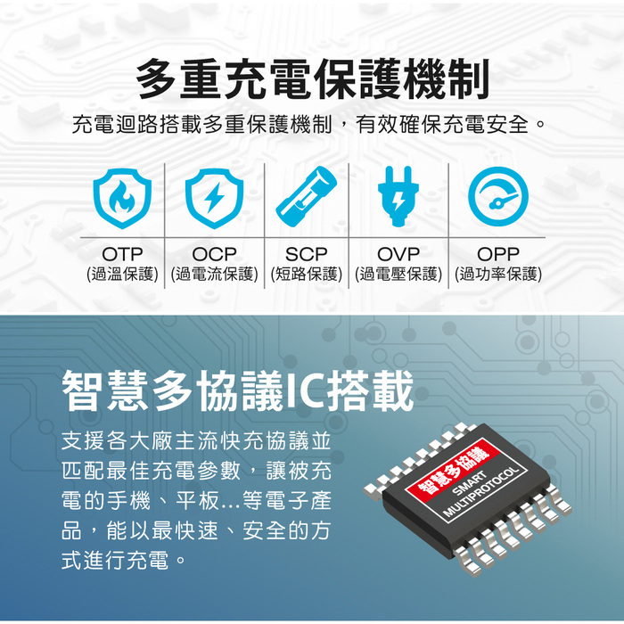 充電器迴路內建OCP(過電流保護)、OVP(過電壓保護)、OPP(過功率保護)、