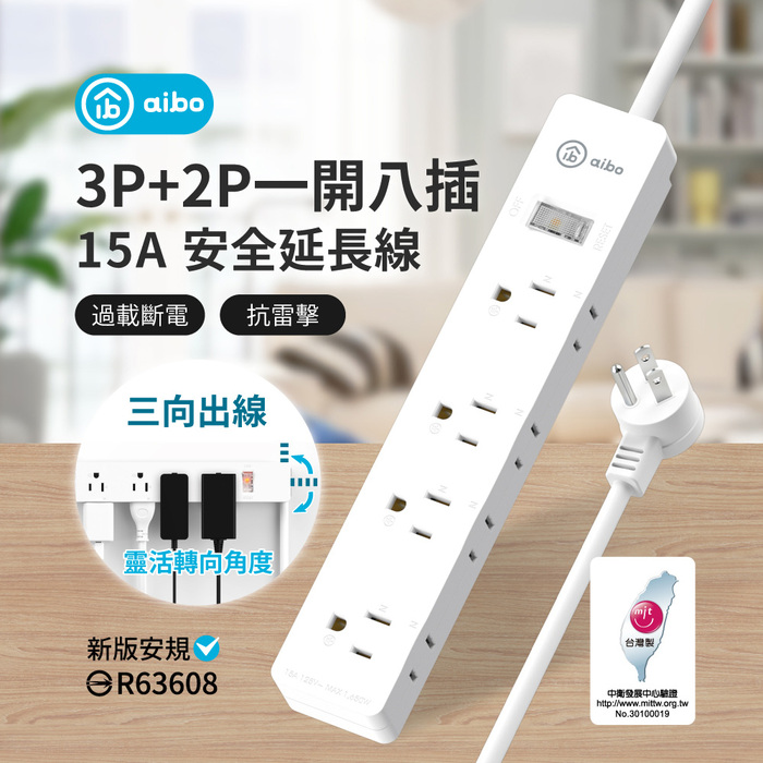 .商品名稱:aibo 1開8插 專利三向出線抗雷擊延長線