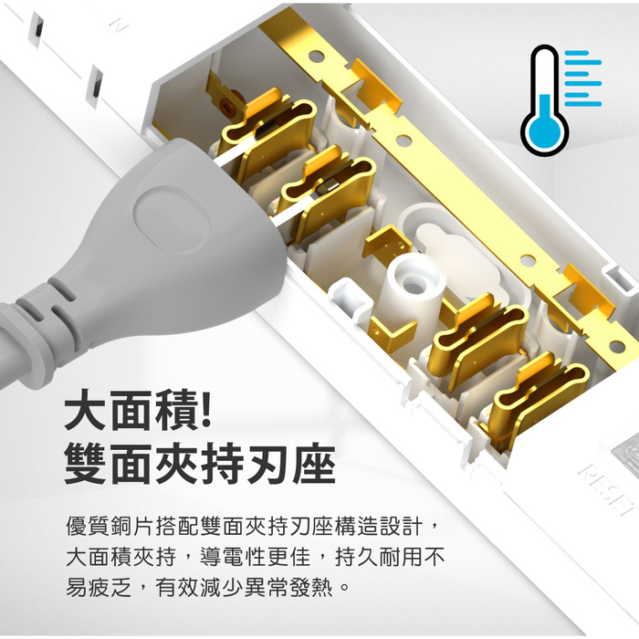 搭配大面積雙面夾持刃座構造,導電性更佳,持久耐用不易疲乏,有效減少異常發熱。
