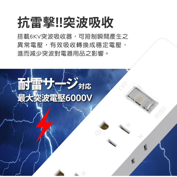 內建6KV突波吸收器,抗雷擊,可箝制瞬間產生之異常高壓,有效吸收轉換成穩定電壓,