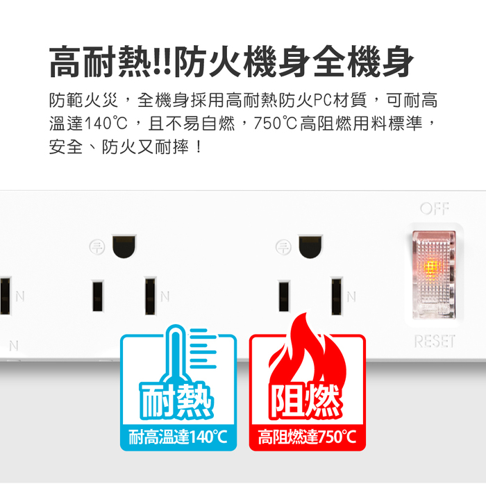 強化用電安全,全機身使用聚碳酸酯(PC)材質,可耐高溫達140°C,且不易自燃,750°C高阻燃用料標準,