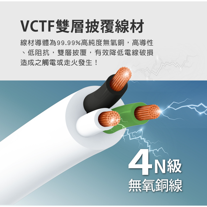 線材導體採用99.99% 4N級高純°無氧銅,並採用雙層絕緣披覆構造,高導性、低阻抗,安全又耐用!
