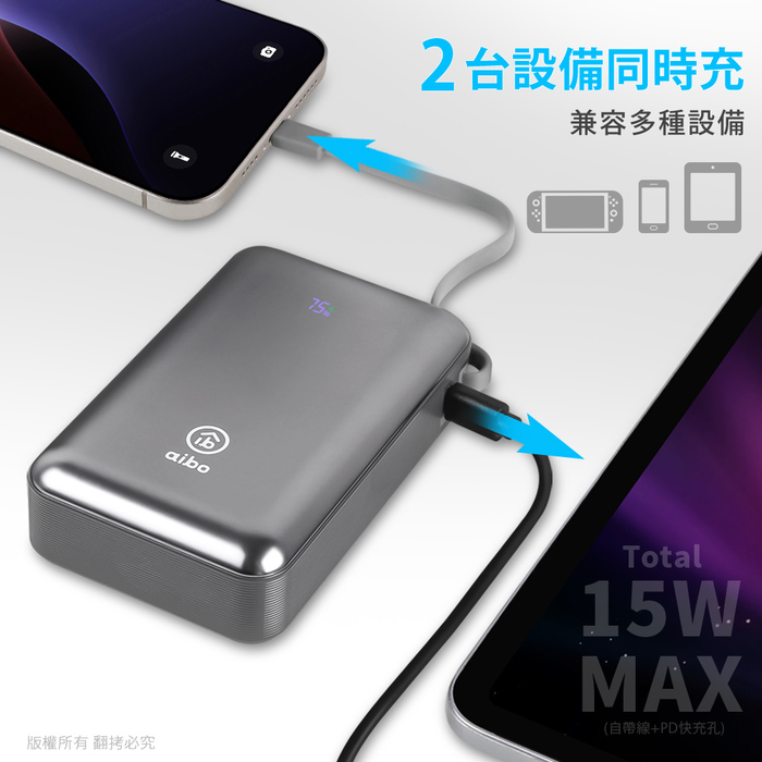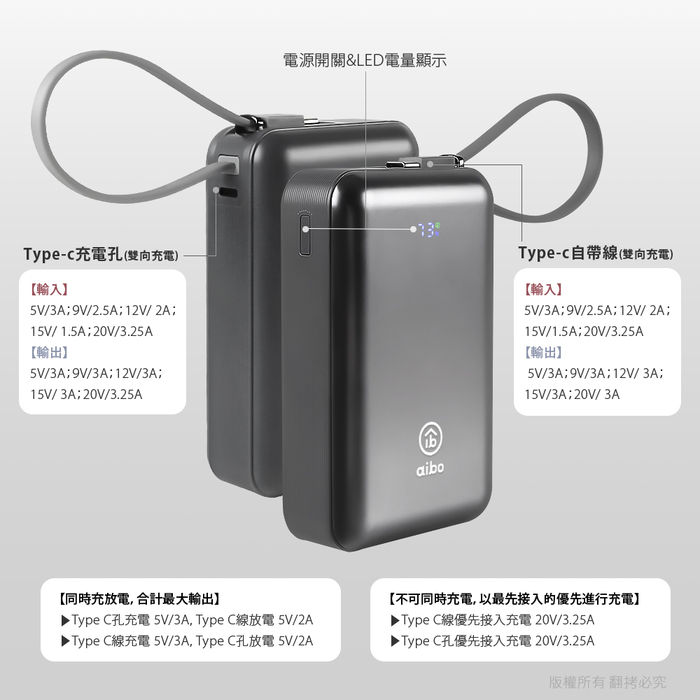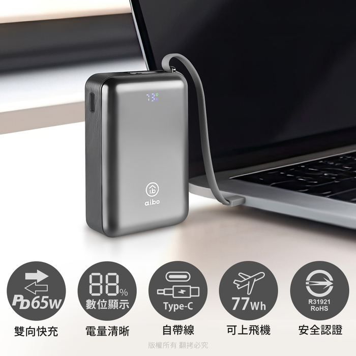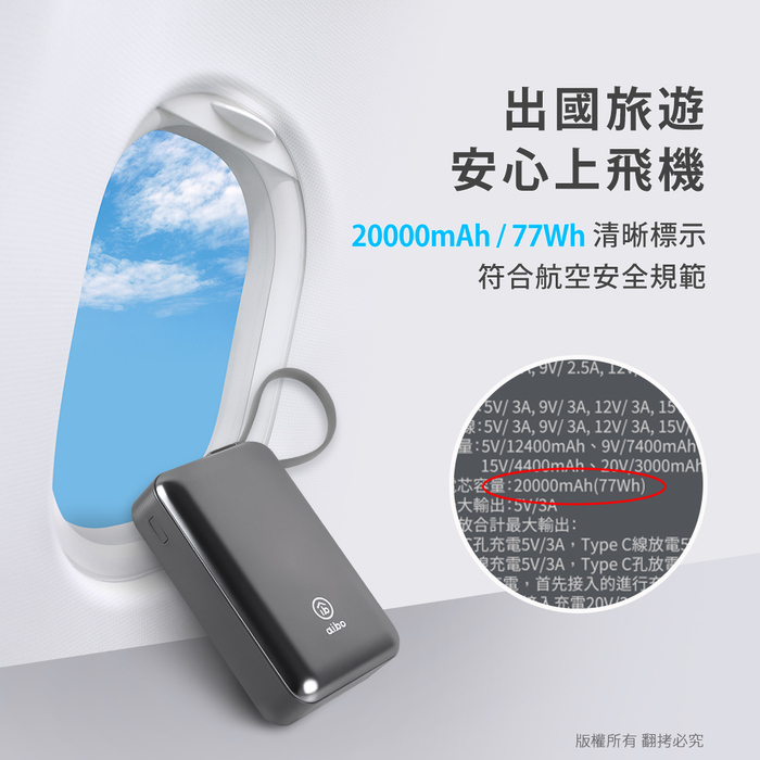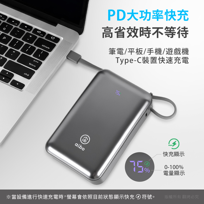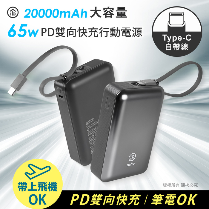 .商品名稱:aibo 20000mAh 65W自帶線大容量雙向快充行動電源(筆電充電)
