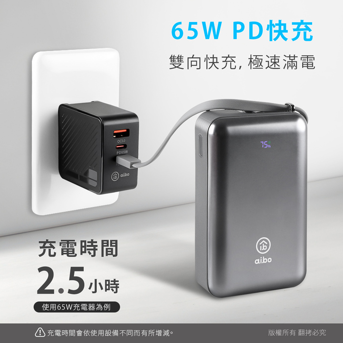 aibo 20000mAh 65W自帶線大容量雙向快充行動電源(筆電充電)