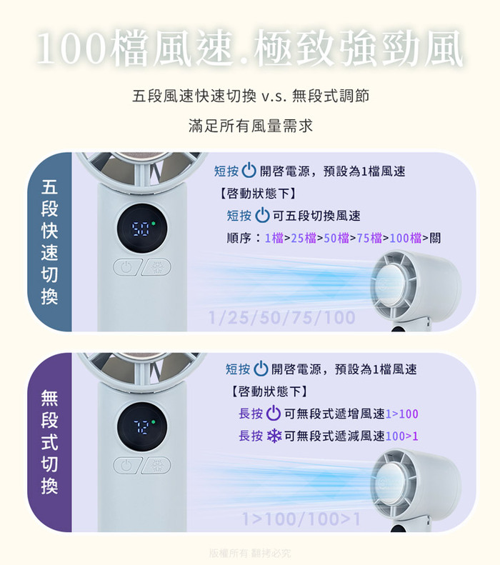 100檔強勁風速,五段式快速切檔 V.S. 無段式風速增減