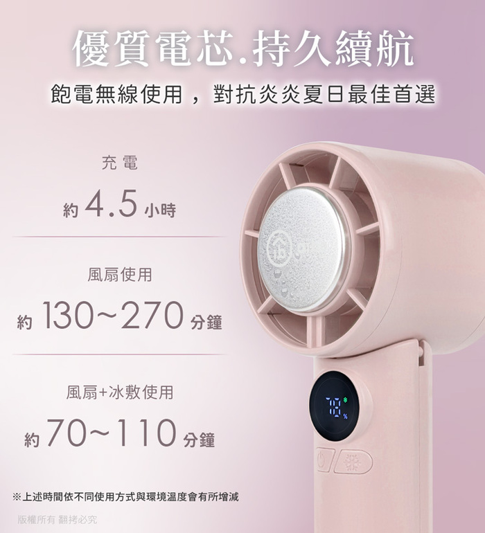 .使用時間:約 2小時10分鐘 ~ 4小時30分鐘 (單獨風扇使用時間)