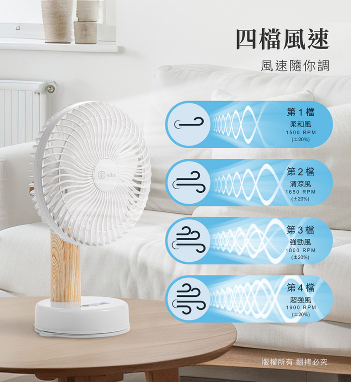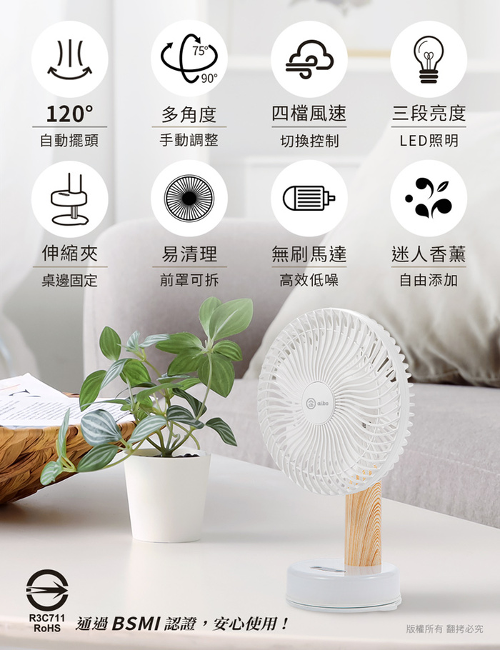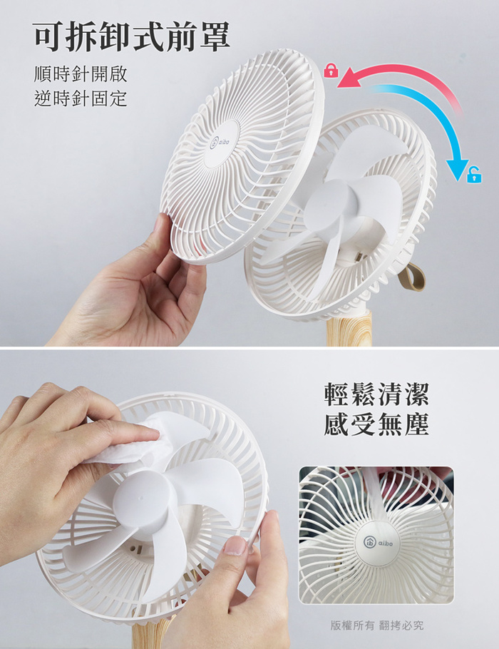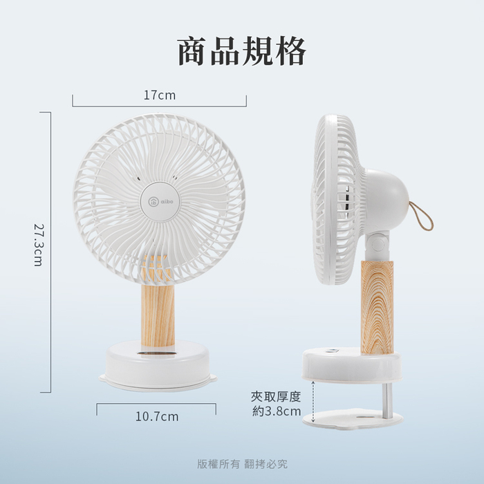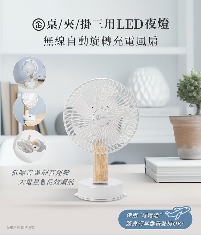 .產品名稱:aibo 桌/夾/掛三用 LED夜燈 無線自動旋轉充電風扇