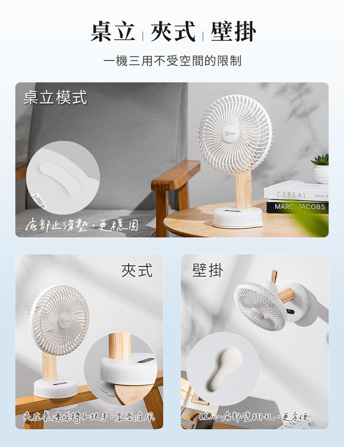 aibo 桌/夾/掛三用 LED夜燈 無線自動旋轉充電風扇