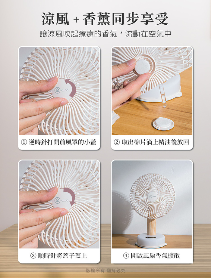內置香薰盒,可在香薰盒內的棉片滴上精油薰香,風扇轉動將香氣擴散,