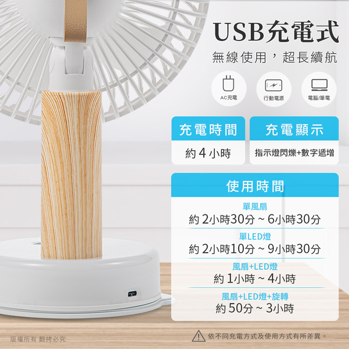 約 50 分 ~ 3 小時 (風扇+LED燈+旋轉使用時間)