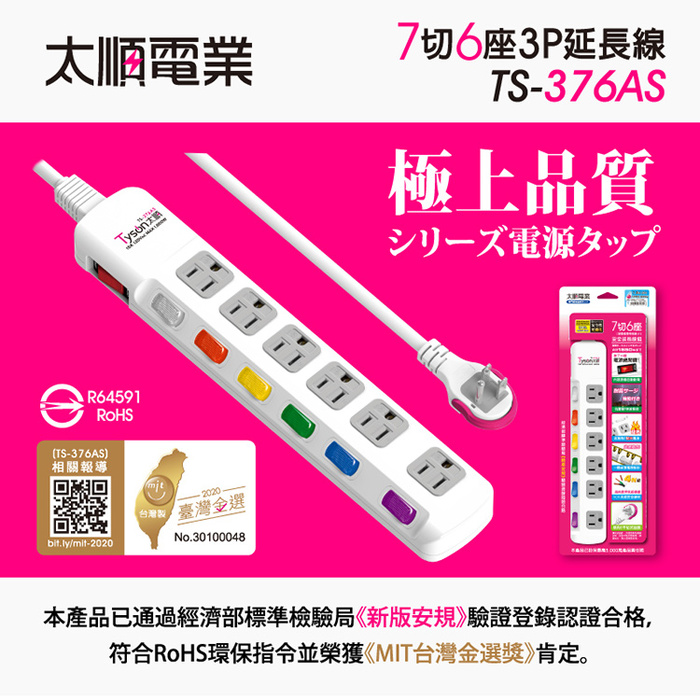 .商品名稱:Tyson太順電業 TS-376AS 3孔7切6座延長線(拉環扁插)