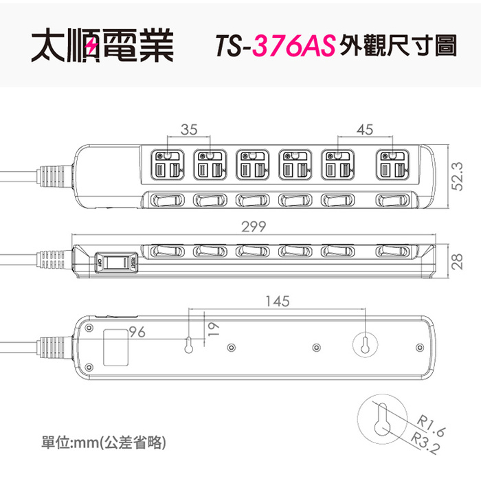 .商品名稱:Tyson太順電業 TS-376AS 3孔7切6座延長線(拉環扁插)