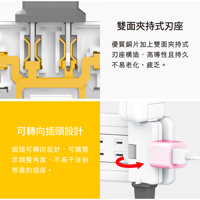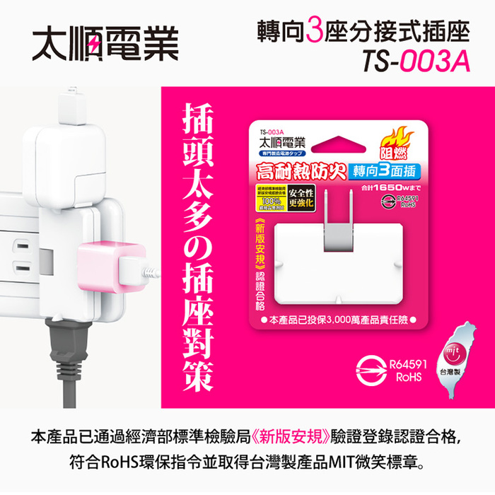 - .商品名稱:Tyson太順電業 TS-003A 2P可轉向3座分接式插座