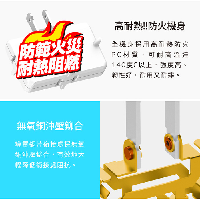處採無氧銅沖壓鉚合,有效降低內部電路阻抗、防範異常發熱產生。