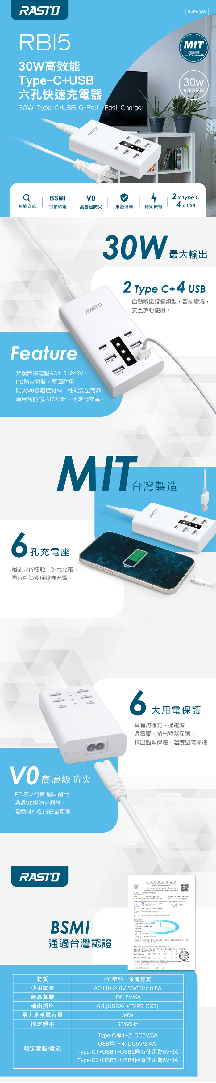 .輸出插座:6孔(USB*4+TYPE C*2)