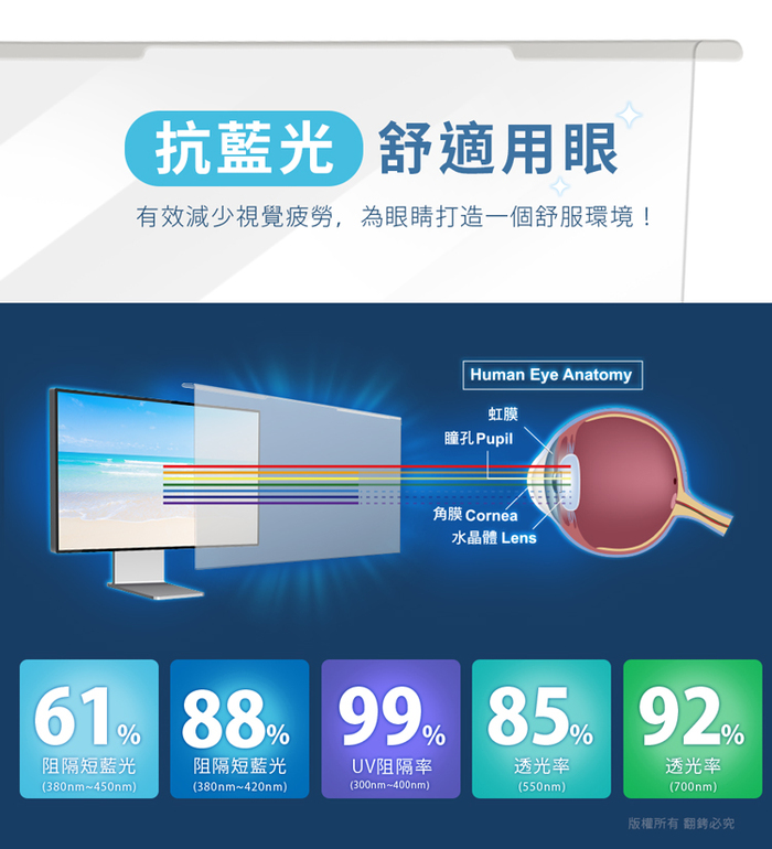 ◆有效降低螢幕藍光、UV光穿透