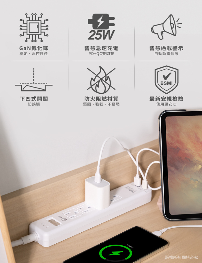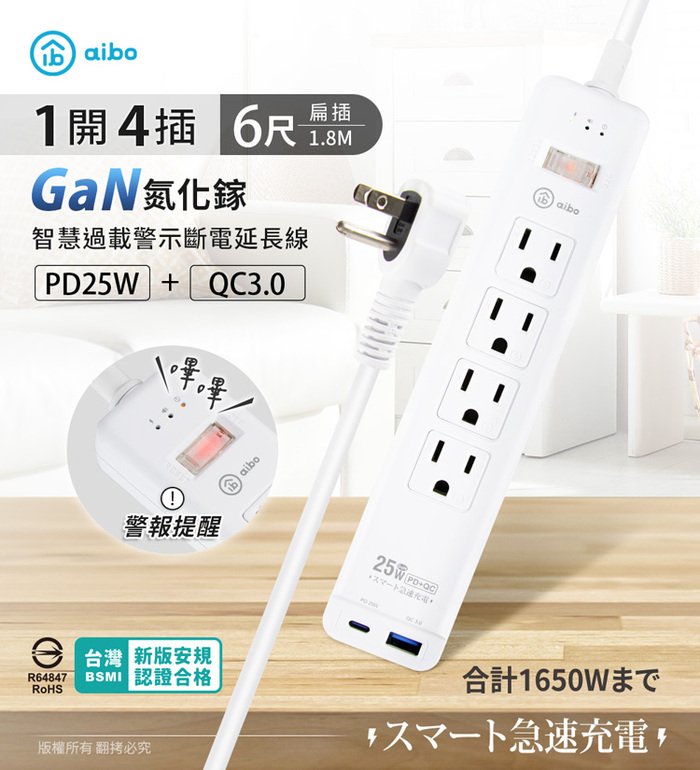 .產品名稱:aibo GaN氮化鎵 1開4插PD25W智慧過載警示斷電 延長線/扁插-1.8米(過載警示蜂鳴器)