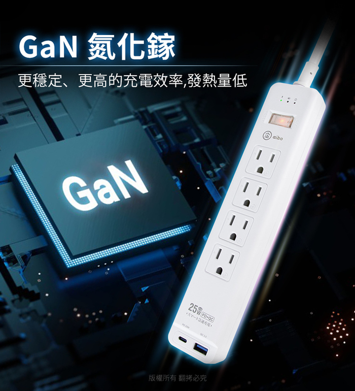 aibo GaN氮化鎵 1開4插PD25W智慧過載警示斷電 延長線/扁插-1.8米(過載警示蜂鳴器)