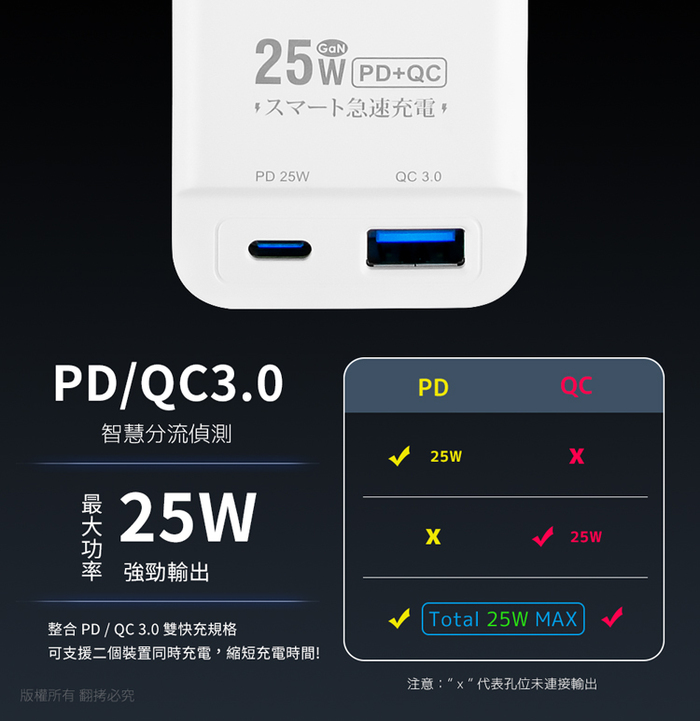◆PD+QC,支援快速充電,最高25W輸出(total/max),多個設備可同時充電
