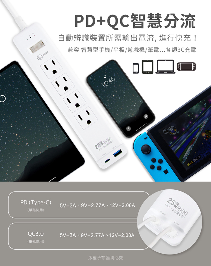 .QC輸出:5V/3A;9V/2.77A;12V/2.08A (25W Max./單埠使用)