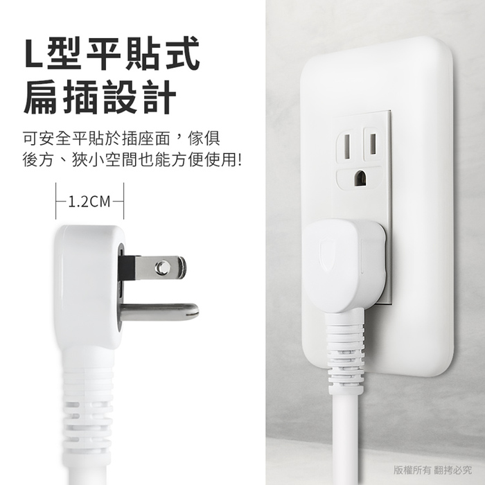 90°L型平貼式插頭設計,可安全平貼於插座面,傢俱後方、狹小空間也方便使用!