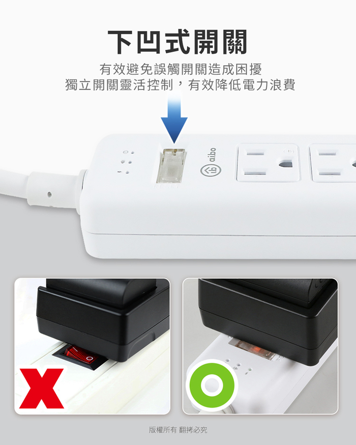 ◆下凹式總開關設計,使插頭不壓迫開關,一鍵即可管理所有電源