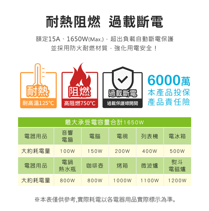 ◆15A/1650W MAX,過載自動斷電,便利又安全