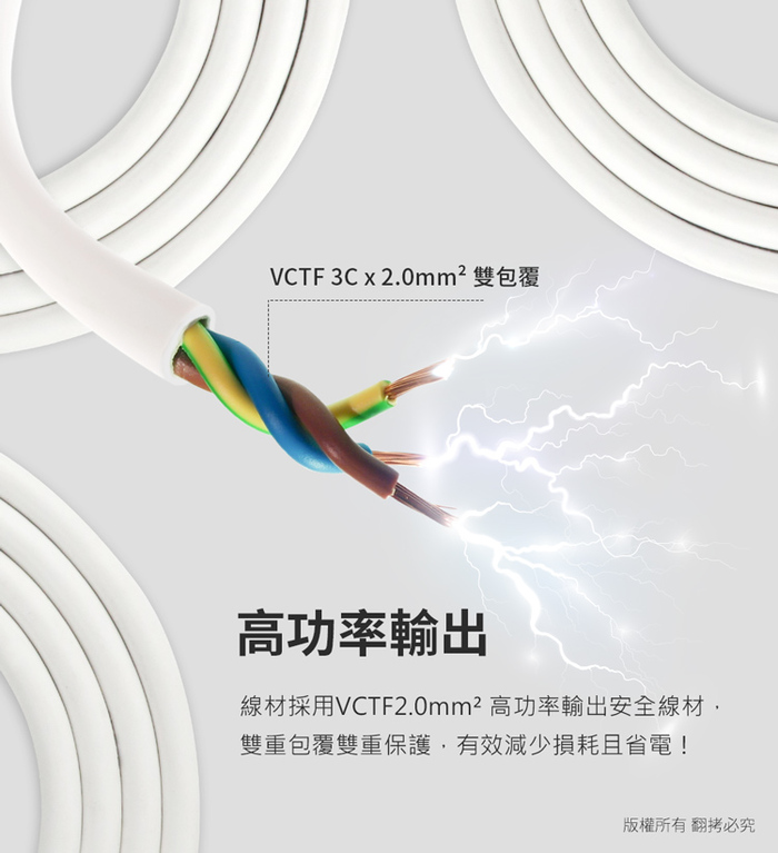 線材採用VCTF 2.0mm²高功率輸出安全線材,內外層皆有絕緣保護,