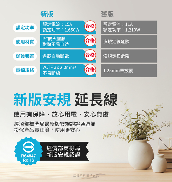 本產品通過經濟部商檢局新版安規認證,放心用電安心無虞!