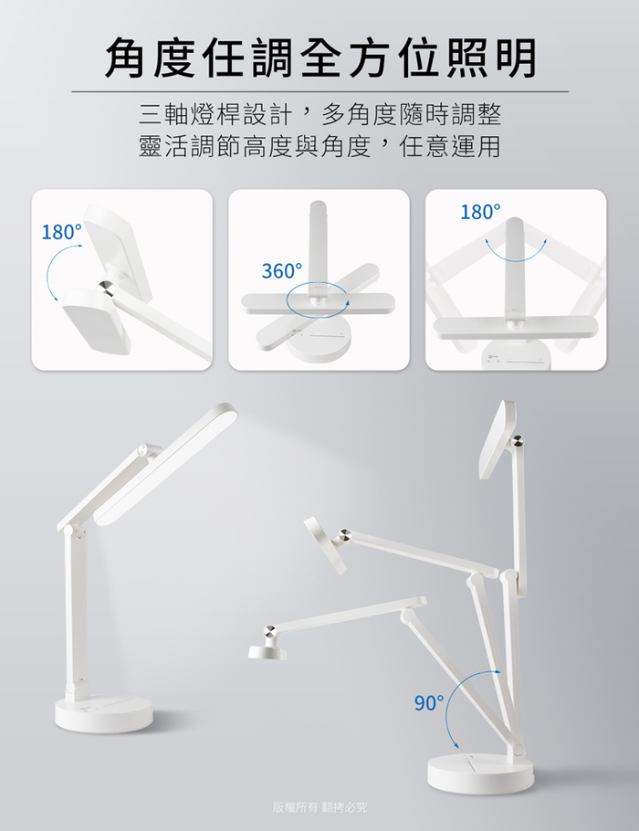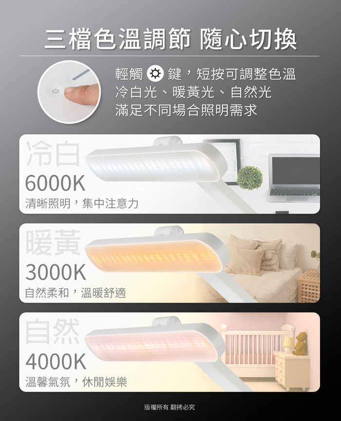 讓閱讀、工作更輕鬆。三種色溫模式切換(冷白光、自然光、暖黃光),