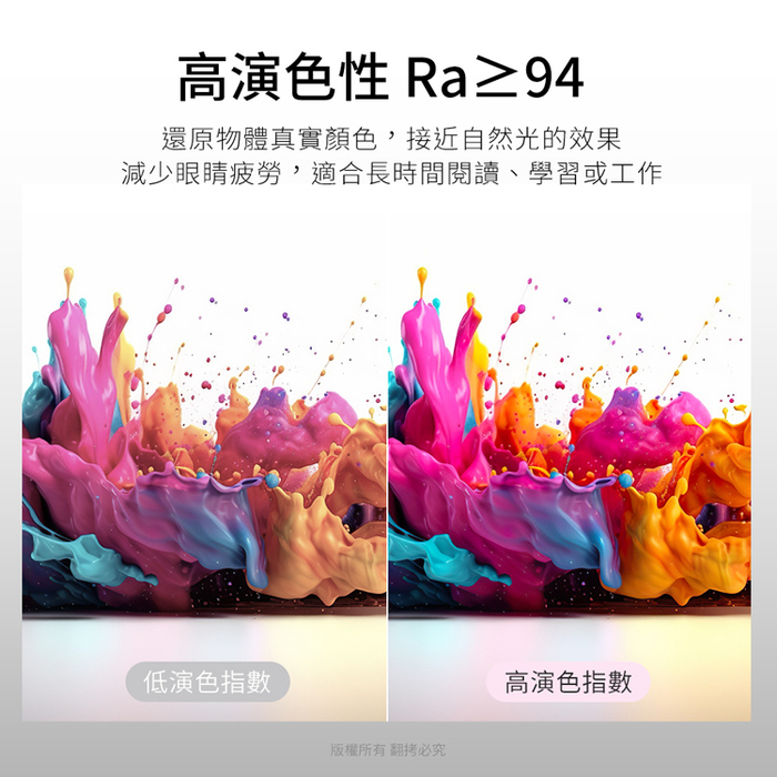 無閃頻設計,長時間使用不易疲勞,舒服照明。Ra≧94高演色,