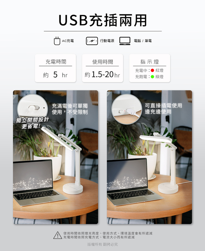 .檯燈充電時,同時使用檯燈,則會延長充電時間。
