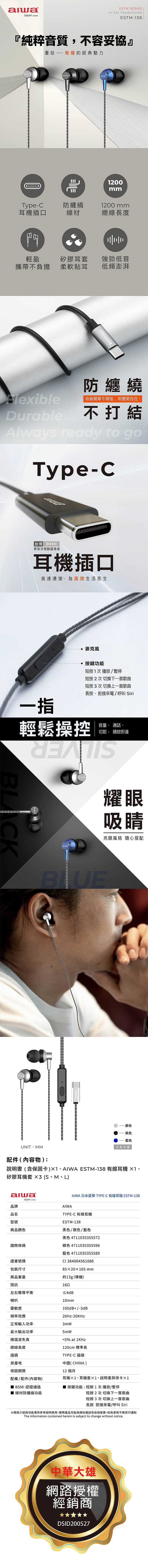 AIWA愛華 防纏繞TYPE-C有線耳機(120cm) ESTM-138