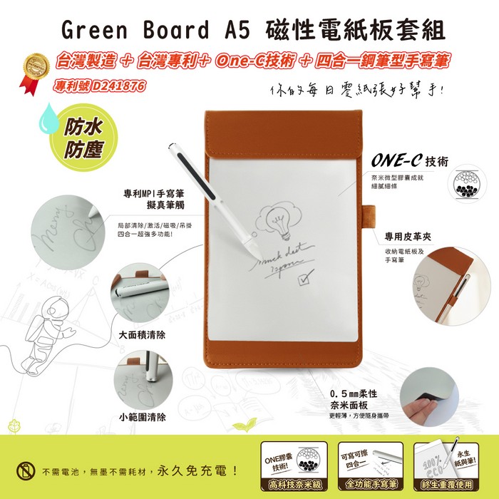 Green Board A5磁性電紙板不需任何紙張、不需充電、不產生電子廢棄物,可重複使用數萬次!以綠色技術實現「真書寫、零耗能」的永續理念,不僅環保愛地球,也幫你省下購買筆記本與耗材的開銷,是學生、上班族、家庭的理想選擇。