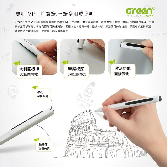 Green Board A5磁性電紙板搭配專利 MP1 手寫筆,筆尖靈敏細膩,書寫流暢不卡頓。筆尾內建精準擦拭頭,可細緻修正局部筆跡;筆身側面則可快速清除大面積內容。輕鬆一擦、整潔如新!激活面可將磁性奈米膠囊將被重新激活,讓你的磁性電紙板每一次書寫,都從清晰開始。