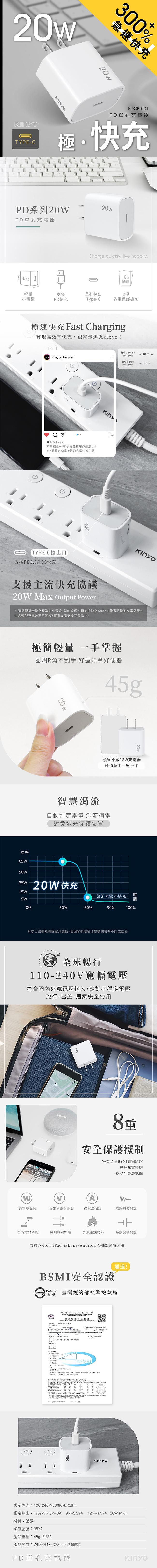 KINYO 單孔充電器20W PDCB-001
