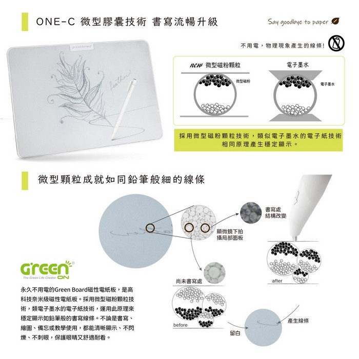 永久不用電的Green Board磁性電紙板,是高科技奈米級磁性電紙板。採用微型磁粉顆粒技術,類電子墨水的電子紙技術,運用此原理來穩定顯示如鉛筆般的書寫線條。不論是書寫、繪圖、備忘或教學使用,都能清晰顯示、不閃爍、不刺眼,保護眼睛又舒適耐看。