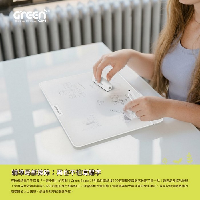 Green Board 15吋磁性電紙板ECO環保版是一款真正實踐綠色生活的產品。每一次書寫都代表省下一張紙,每一天使用都代表減少了廢棄電池的產生。對於致力於推動無紙化辦公的企業,或是重視環保教育的家庭,Green Board 提供了一個具備經濟效益且友善地球的選擇。無藍光、無背光的物理顯示技術,更是長時間使用的學生與商務人士保護視力的最佳方案。