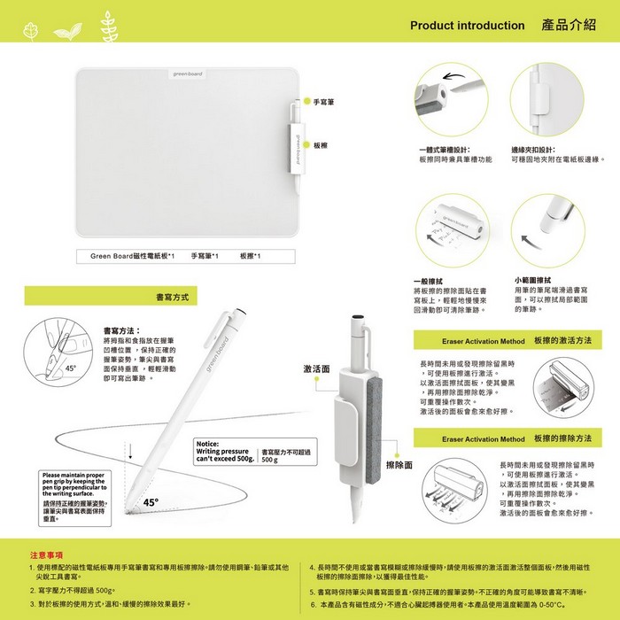 1.使用標配的磁性電紙板專用手寫筆書寫和專用板擦擦除。請勿使用鋼筆、鉛筆或其他尖銳工具書寫。