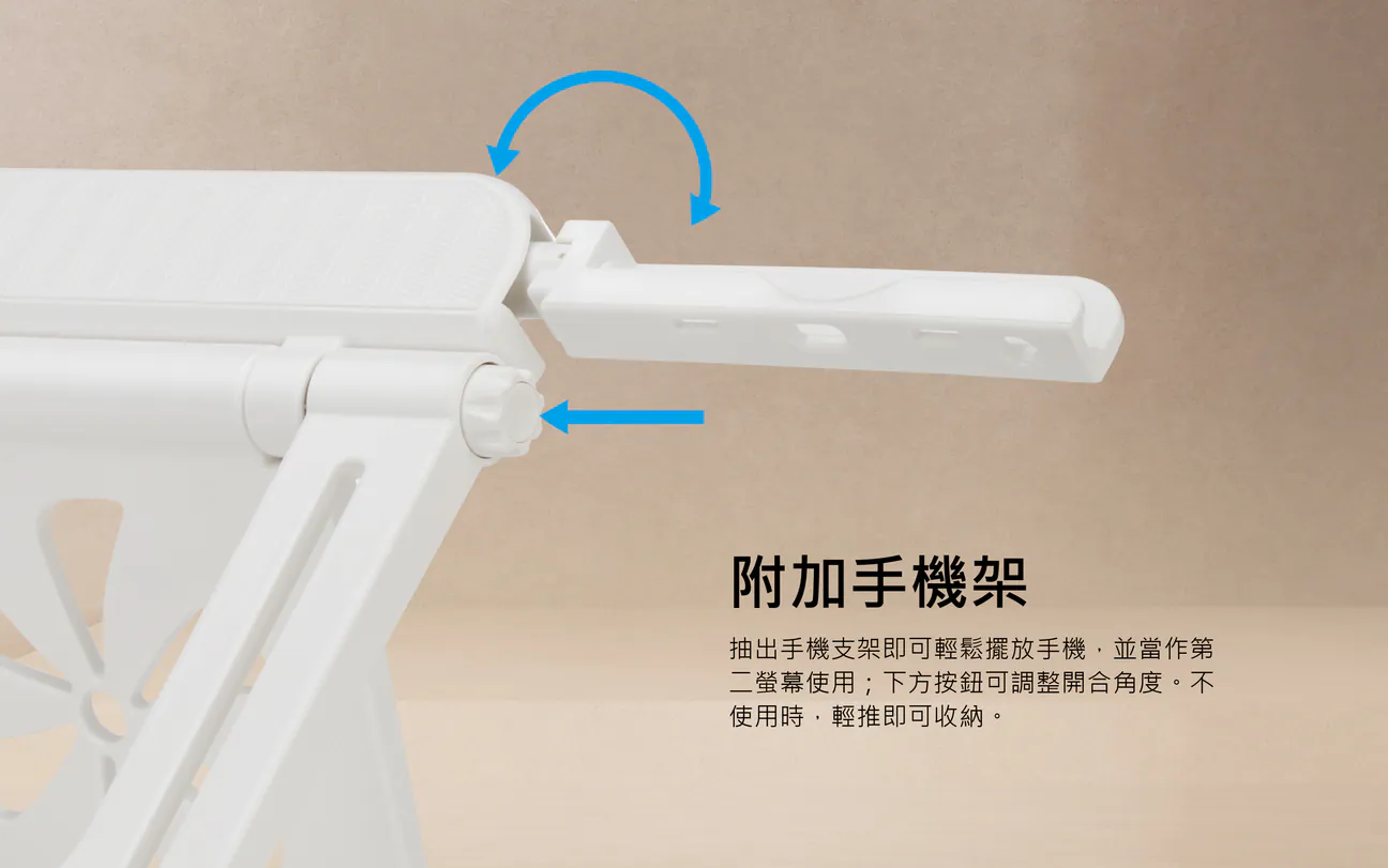 ● 內建手機支架:雙屏工作,適合同時處理多項任務