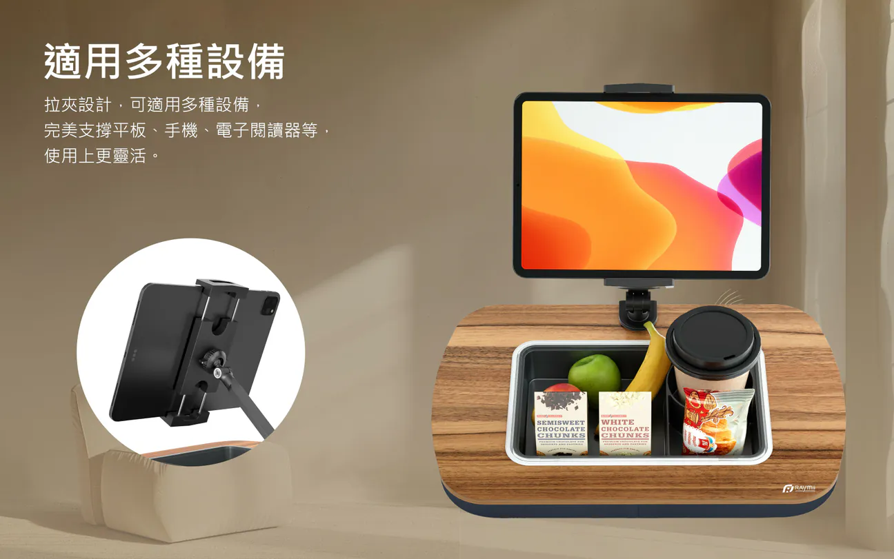 3. 多功能存放:可拆卸的矽膠零食碗易於清潔,並具有三個隔間,可存放零食、飲料或遙控器和眼鏡等小物品