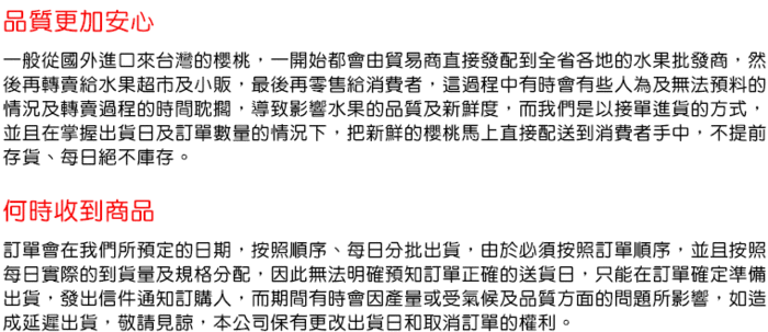 *櫻桃於運送途中會有少許損傷,為合理消耗敬請諒解,下單前請務必考慮、詢問清楚!