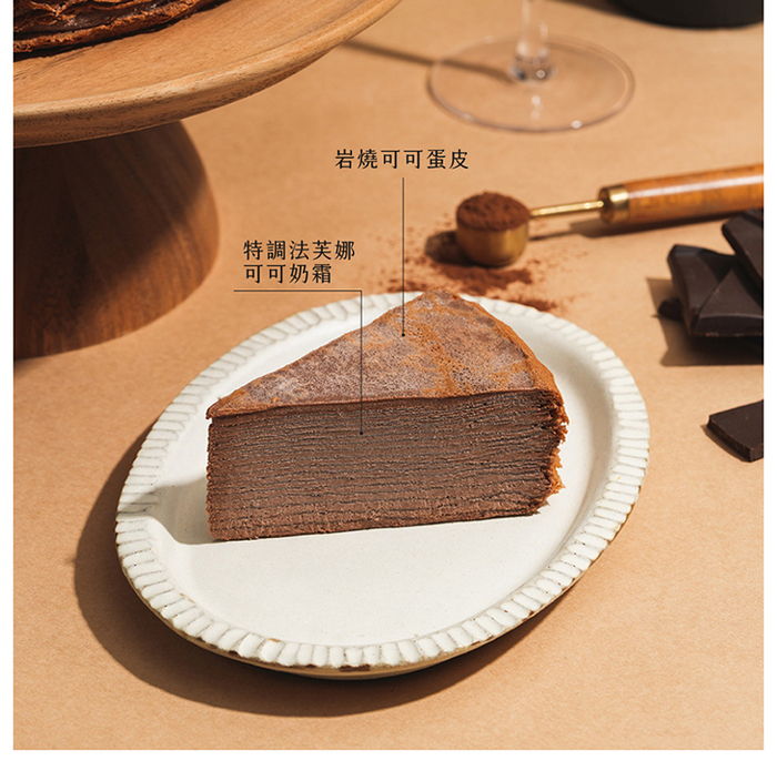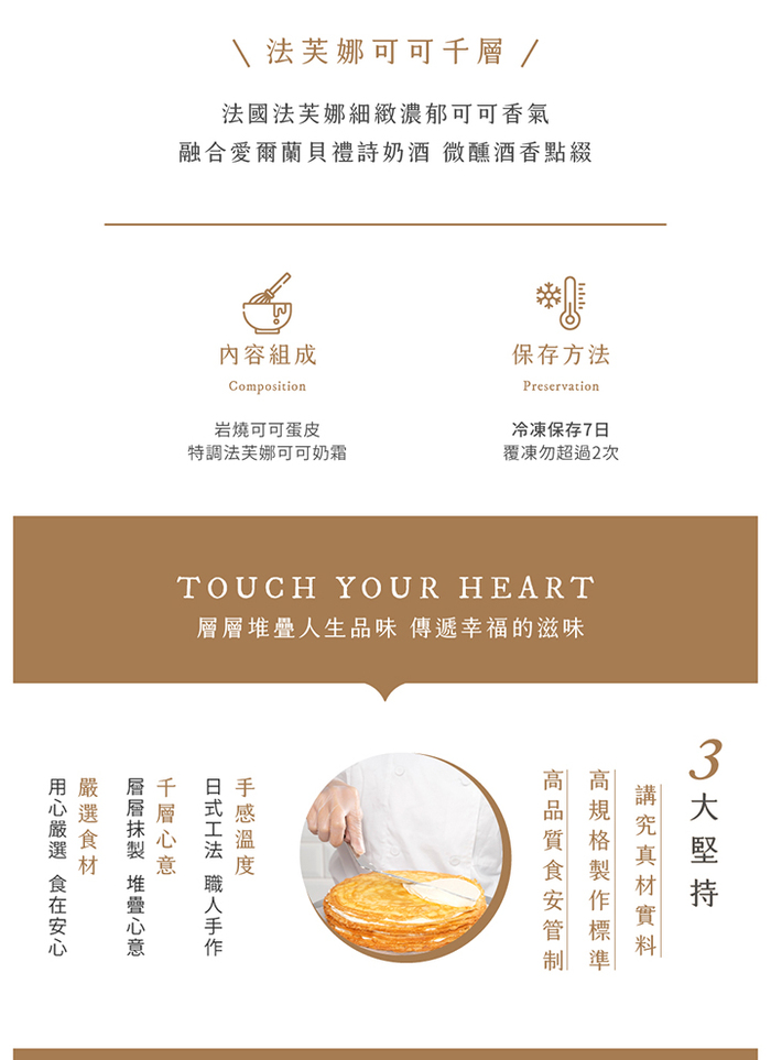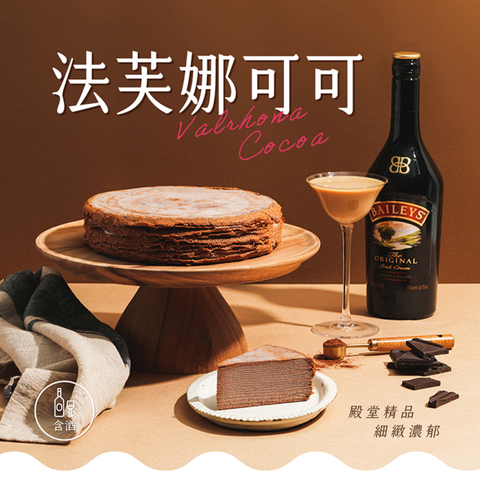 商品規格】 成份: 新鮮雞蛋,麵粉,奶粉,水,鹽,砂糖,澱粉,鮮奶油,可可粉,無水奶油,貝里斯奶酒。 尺寸: 8吋,高度約4cm 素葷食: 葷食 保存期限: -18度C冷凍,建議7天內食用完畢,實際有效期限請見包裝標示。 產地: 台灣