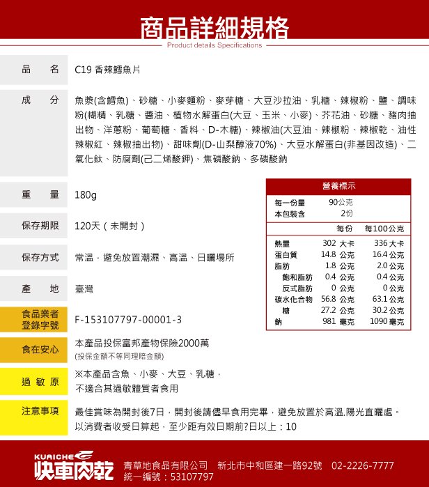 1.商品組合/規格:香辣鱈魚片 2.商品重(容)量:180g 3.內容物名稱(成分):如圖所示