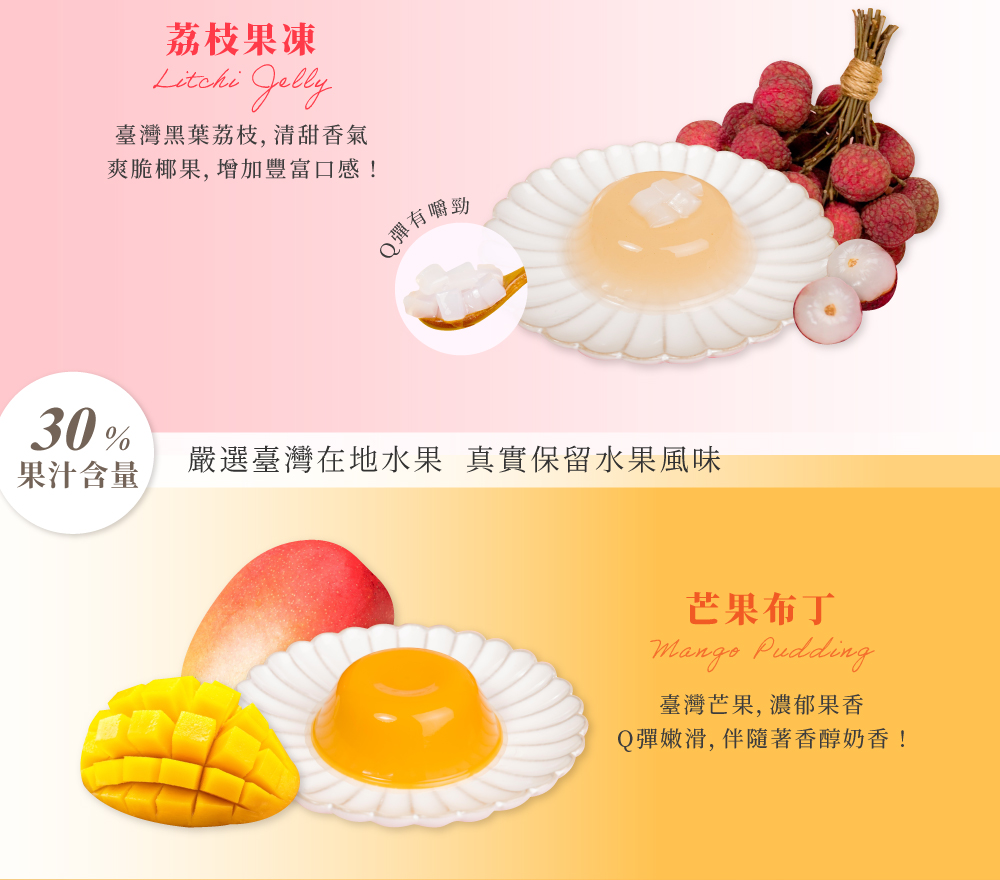 選用台灣芒果及荔枝鮮榨成汁,真實保留水果香氣,Q彈滑嫩的口感,滿足品嘗的每一刻。