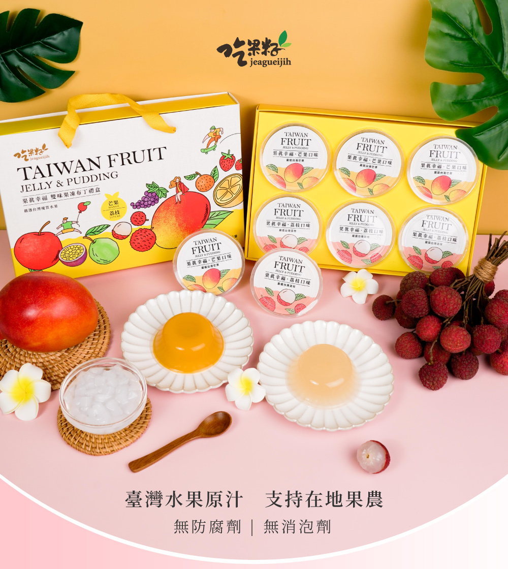 2.商品品名:【吃果籽】果真幸福 果凍布丁6入禮盒 (芒果+荔枝)