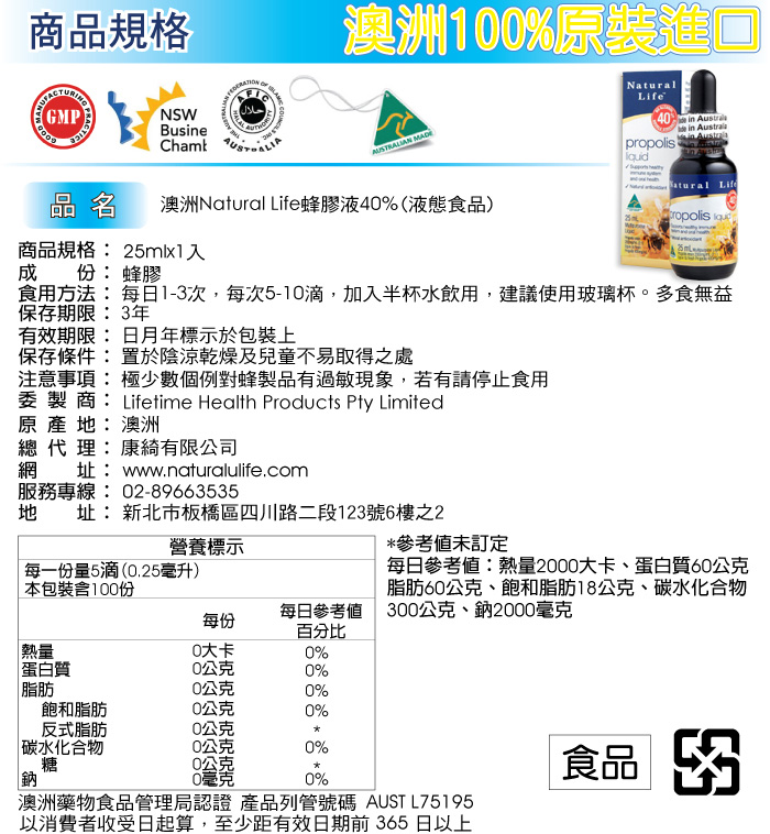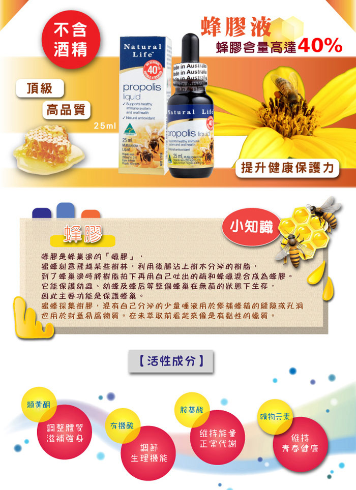 ◆產品名稱:澳洲Natural Life無酒精40%蜂膠液(25ml)