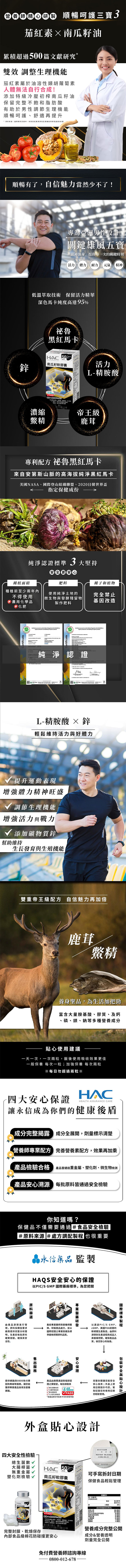 商品成分:黑馬卡粉、南瓜籽油、EFLA940南瓜籽萃取物、黑麥花粉萃取物、番茄紅素、L-精胺酸、鹿茸粉、鱉精粉、鋅